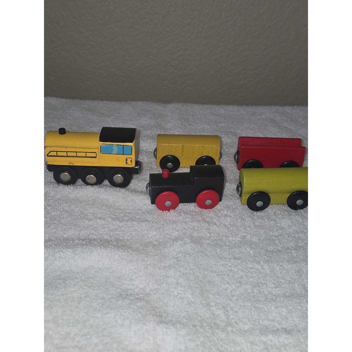 Wooden Train Engine & 4 Cargo Box Cars is a classic wooden train set featuring a sturdy locomotive & four colorful cargo box cars. Each car is designed with magnetic connectors for easy attachment & detachment, promoting fine motor skills & imaginative play.