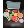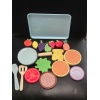 Contains: 1- Wooden Skillet, 1- Plastic Tray, 1- Apple , 1- Strawberry, 1- Pineapple, 1- Pear, 1- Lemon, 1- Orange, 1- Purple Grapes, 1-Wooden Blue Spoon, 1- Small Wooden Spatula