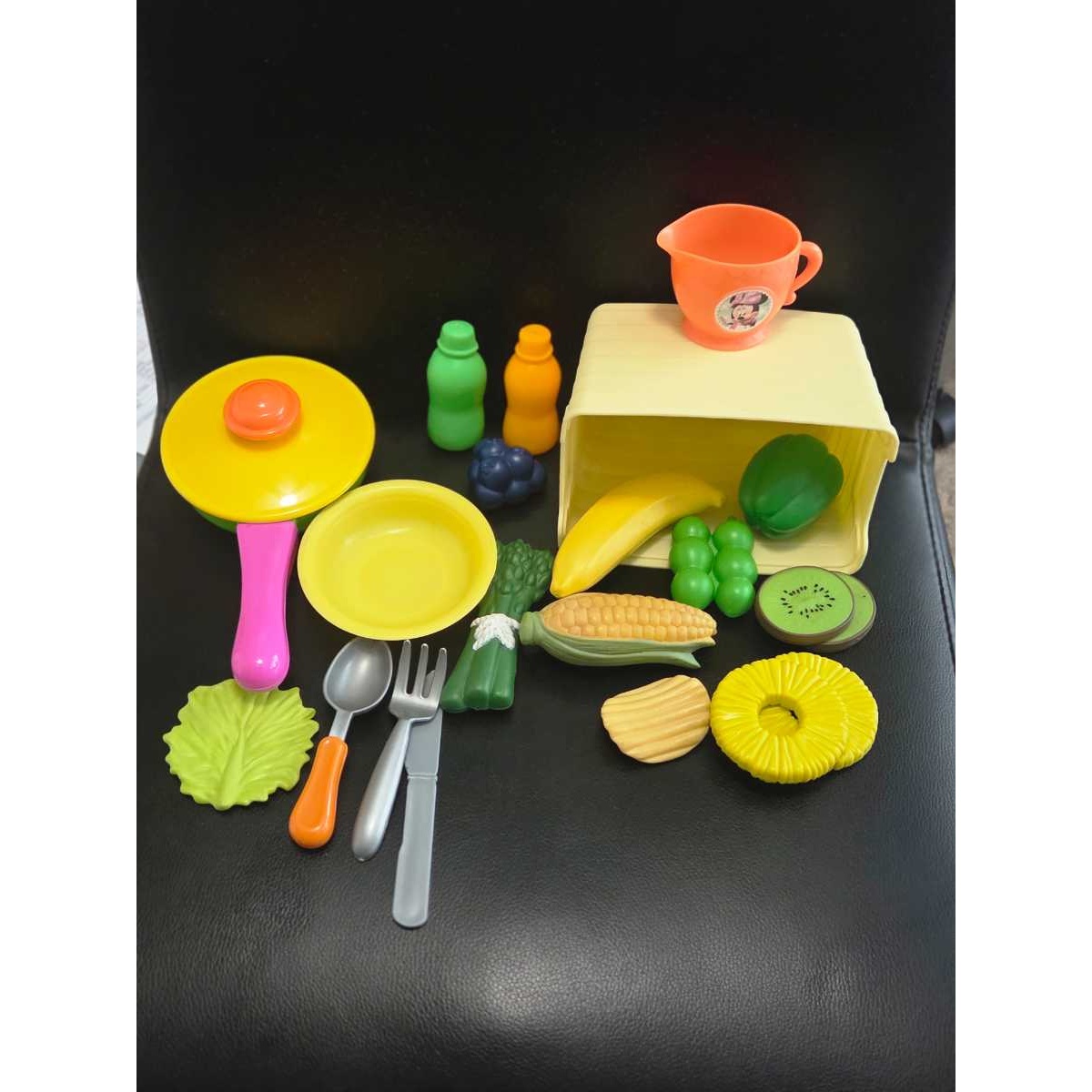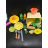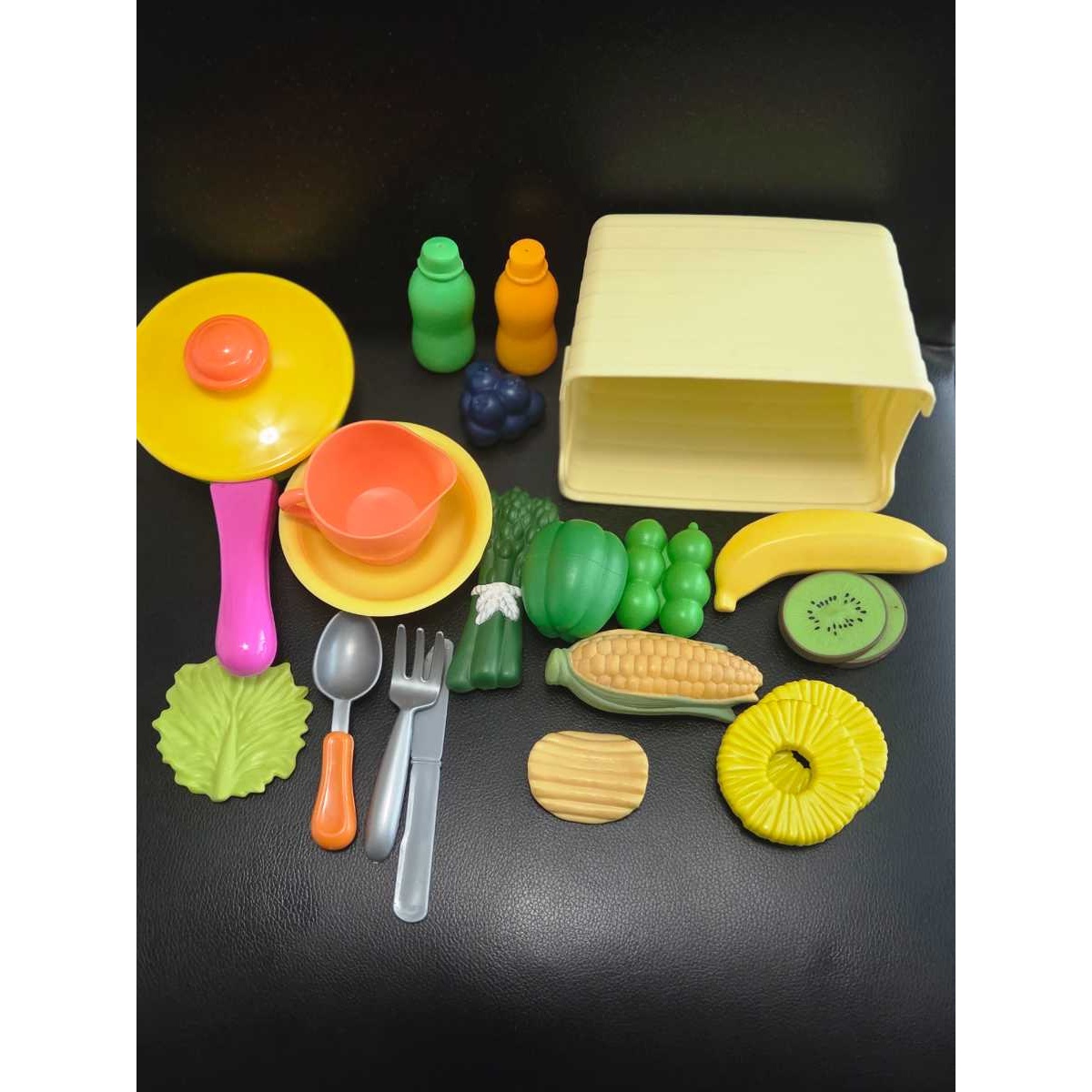 Contains: 1- Yellow Crate, 1- Colorful Skillet, 1- Orange Tea Cup, 1- Yellow Bowl, 2- Small Bottles (Green & Orange)
