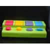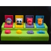 This toy features a green base with four colorful buttons and corresponding pop-up characters. The buttons are shaped like a ladybug (red), a flower (yellow), leaves (purple), and a fish (blue). Pressing a button makes the corresponding animal pop up. The toy is designed to help young children develop fine motor skills and learn cause-and-effect relationships.